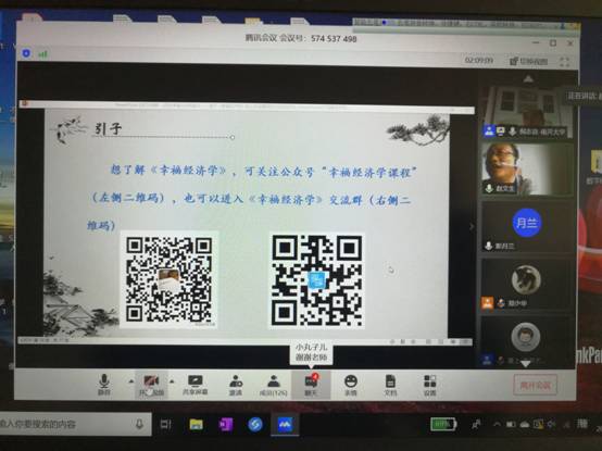的130多名师生参加了这次在线学术讲座,彭月兰教授代表学院对倪志良教授的讲座表示感谢,信息量大,收获很多,是课程思政的一个典范。赵文生教授交流了一些体会和随想:人生在世,生命是前提,幸福是追求。维系人际关系有两条纽带,一个是慈善,另一个是自利,这好比是人类社会的DNA螺旋结构。慈善和自利具有互补关系,随着心里距离的增加,慈善的力量在递减,自利的力量在递增。提出在经济学的学习和研究中,慈善和自利都应予以关注,而不是仅仅强调自利人假设。最后结束时强调,幸福很简单,简单很幸福;幸福是靠奋斗得来的;人民有信仰,民族有希望,国家有力量。