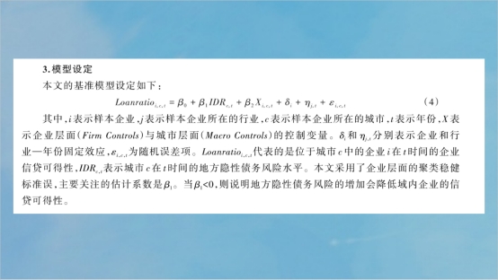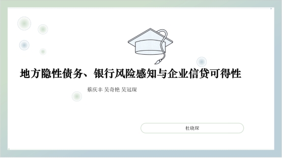 《地方隐性债务、银行风险感知与企业信贷可得性》一文,构建了政府、银行以及企业三个方面的联动框架,研究地方隐性债务风险如何影响域内企业信贷可得性。杜晓琛同学分别从理论假设、模型设定、实证结果、内生性和机制几个方面进行了详细地分析,研究发现,地方隐性债务风险的增加会降低域内企业的信贷可得性,也并没有导致企业外部融资约束的提升。然而,向商业信用融资的转变,存在域内重大风险向外蔓延的可能。本文的研究厘清了地方隐性债务风险通过银行风险感知作用于实体经济和微观企业的内在渠道,为地方政府实现“防风险”和“稳增长”双重目标提供了有益思考。