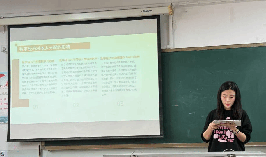 随后,第三位郭玉洁同学聚CGE模型在收入分配与贫困治理中的应用。通过对CGE模型的基本原理、模型架构以及参数设定进行详细介绍,展示了该模型在模拟经济系统运行方面的强大功能。从多个层面阐述了CGE模型如何通过模拟不同政策冲击下经济主体行为的变化,分析收入分配格局的动态演变,揭示贫困发生的深层次原因。以某地区的实证研究为例,验证了CGE模型在制定针对性扶贫政策、评估政策效果方面的重要作用,为解决社会公平问题,推动贫困地区经济可持续发展提供了新的思路与方法。